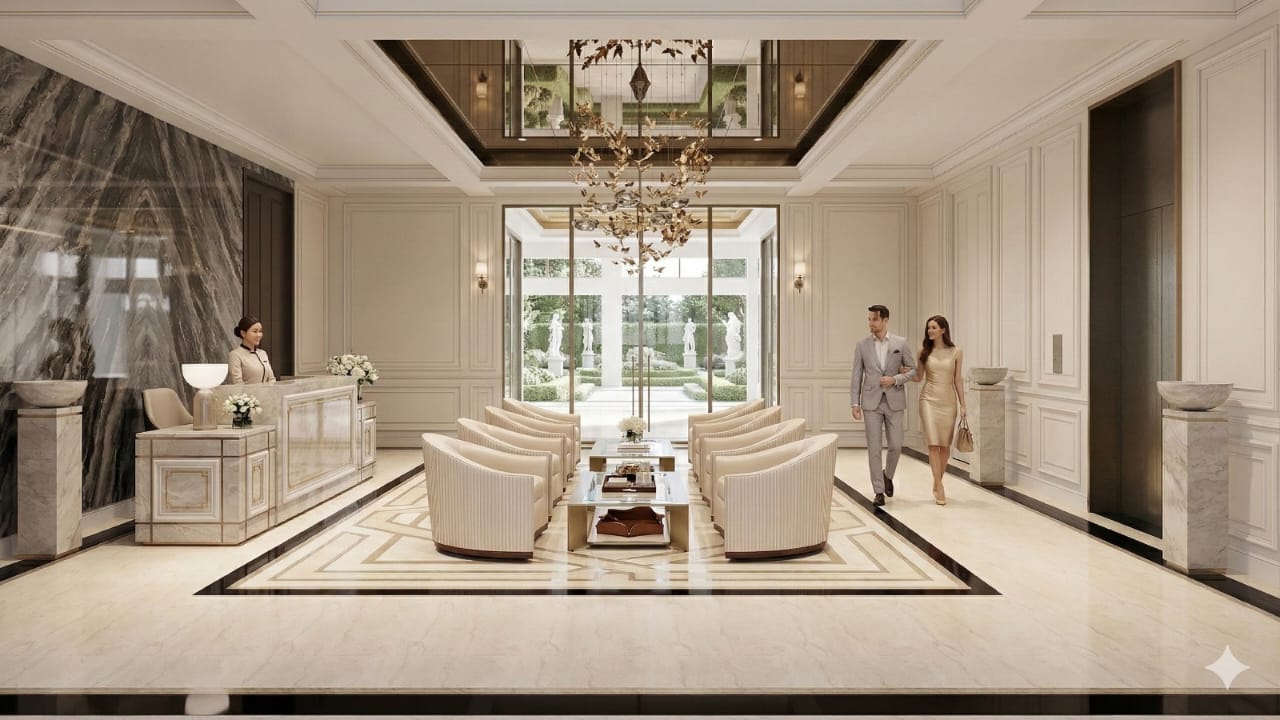 Лобби (зоны ресепшн) комплекса The Essence с роскошной архитектурой и сервисом международного уровня.
