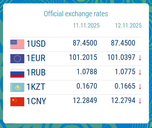 11/11/2025, 16:07As of 12 November 2025, the official exchange rate of the US dollar in Kyrgyzstan remained at 87.4500 KGS, with no changes recorded.