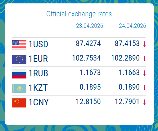 04/23/2026, 16:20The National Bank has published the official exchange rates for 24 April. All major currencies have fallen against the KGS.