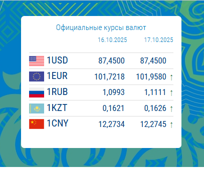 10/16/2025, 16:43On October 17, 2025, the official exchange rate of the US dollar in Kyrgyzstan remained unchanged at 87.4500 KGS.