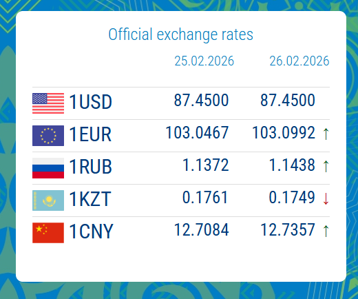 02/25/2026, 16:12According to data from the National Bank of the Kyrgyz Republic as of 26 February, the US dollar exchange rate remained stable at 87.4500 KGS.