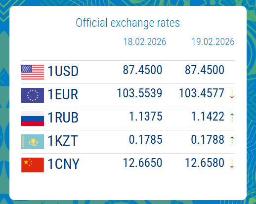 02/18/2026, 16:10The National Bank of the Kyrgyz Republic has published the official exchange rates for 19 February 2026.