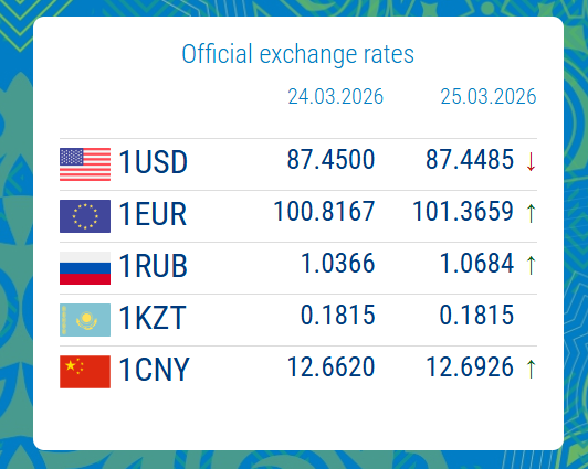 The Russian rouble showed the most significant movement — its exchange rate rose by 3.06% to 1.0684 KGS. The Kazakhstani tenge remained stable at 0.1815 KGS.