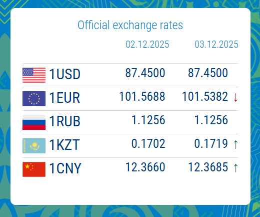 12/02/2025, 16:40According to data from the National Bank on 3 December, the US dollar exchange rate remained at 87.4500 KGS.