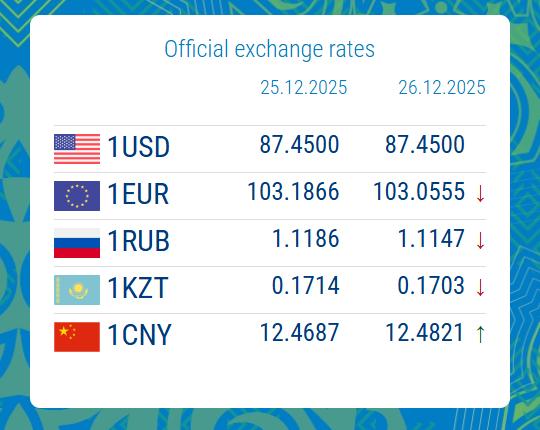 12/25/2025, 18:29On 26 December 2025, the official US dollar exchange rate remained at 87.4500 KGS, showing no change from the previous day.