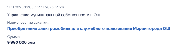 Согласно данным на портале государственных закупок, Управление муниципальной собственности города Ош объявило тендер сегодня, 11 ноября, на приобретение электромобилей для нужд мэрии.