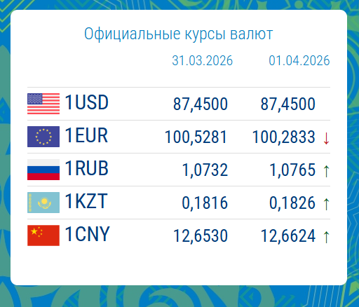 31.03.2026, 16:29Национальный банк опубликовал официальные курсы валют на 1 апреля 2026 года. Доллар США остался на уровне 87.4500 сома.