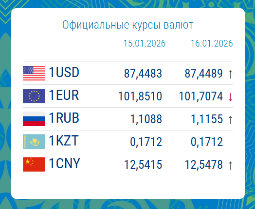15.01.2026, 16:23На 16 января 2026 года официальный курс доллара США составил 87.4489 сома, увеличившись на 0.0007%.