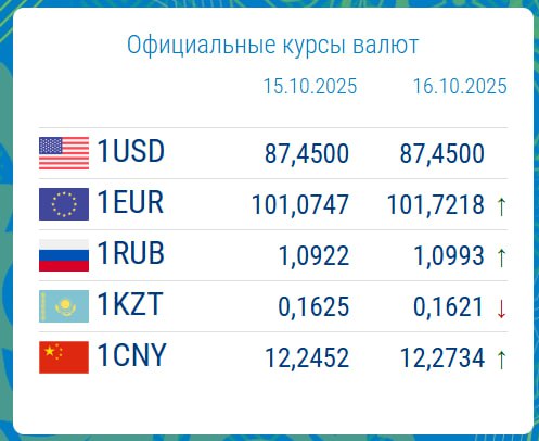 15.10.2025, 16:21Национальный банк опубликовал официальные курсы валюты на 16 октября. Согласно обновленным данным, доллар США также стоит 87.45 сома.