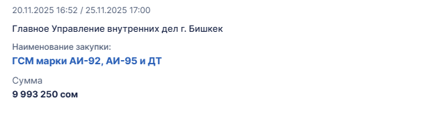 20.11.2025, 17:35Главное управление внутренних дел объявило закупку дизельного топлива и бензина на общую сумму почти 10 млн сомов для обеспечения своей деятельности.