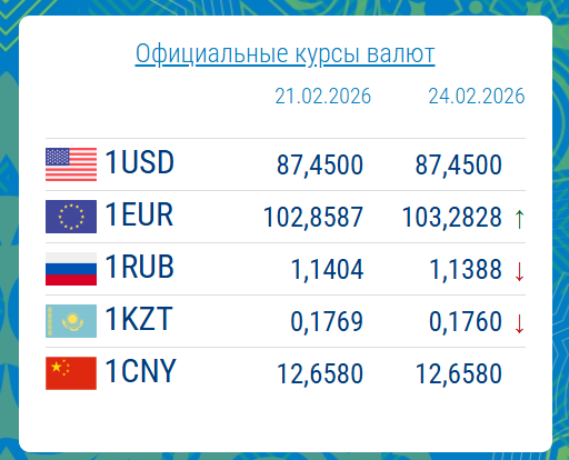 23.02.2026, 16:28По данным Национального банка Кыргызской Республики на 24 февраля, курс доллара США остался стабильным и составил 87.4500 сома.
