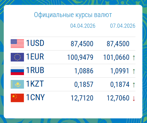 06.04.2026, 16:17Нацбанк обновил официальные курсы валют на 7 апреля. Доллар США остался без изменений — 87.4500 сома.