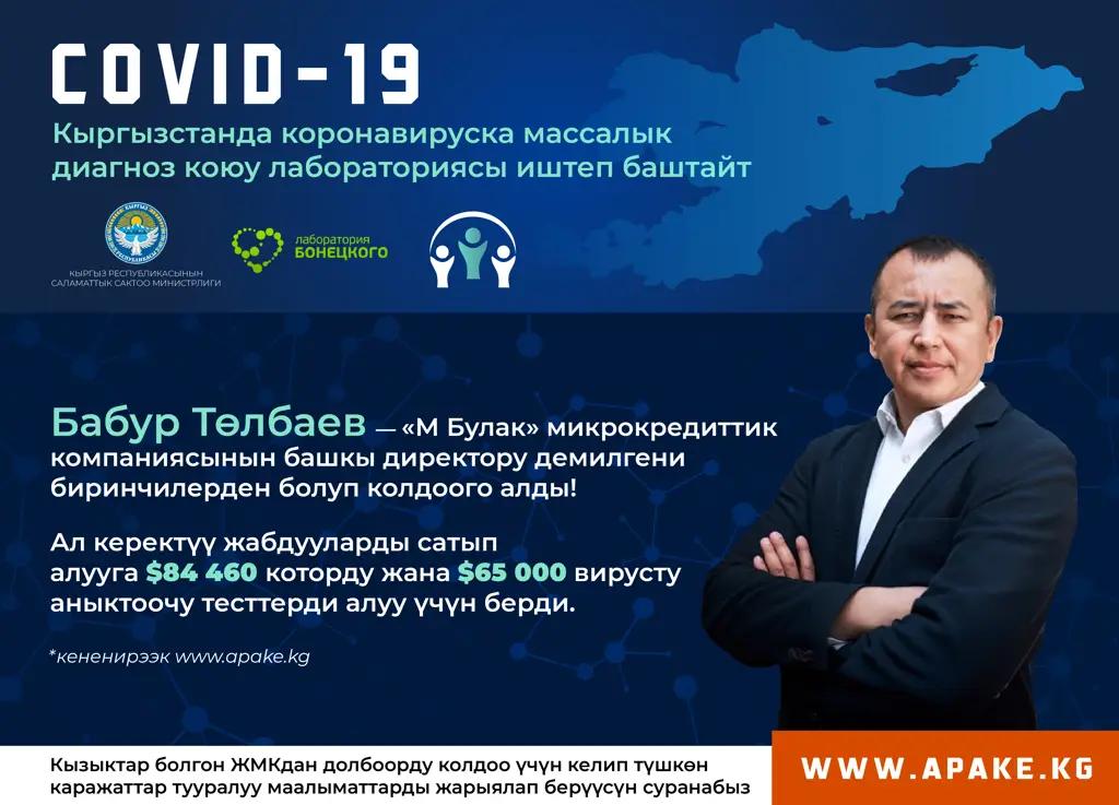 Аталган демилгени биринчилерден болуп «М Булак» микрокредиттик компаниясынын башкы директору Бабур Төлбаев колдоого алды. Ал 84 миң 460 АКШ долларын керектүү жабдууларды сатып алууга которду жана 65 миң АКШ долларын вирусту аныктоочу тесттерди алуу үчүн берди.