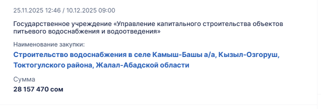 25.11.2025, 15:59Госучреждение по капитальному строительству объектов питьевого водоснабжения открыло закупку на 28.1 млн сомов для обеспечения водой жителей Камыш-Башы.