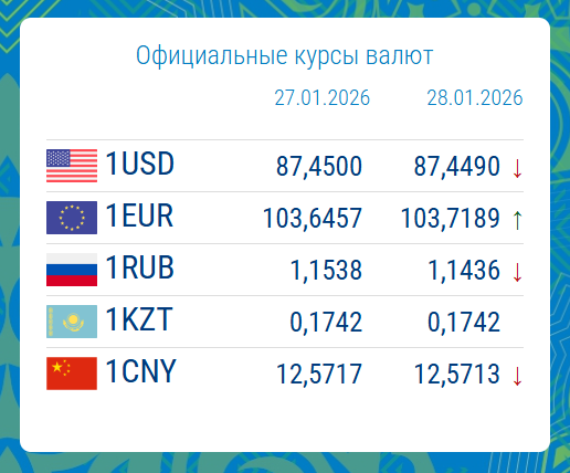 27.01.2026, 17:06Национальный банк обновил официальный курс иностранной валюты к сому на завтра, 28 января. Информация размещена на сайте регулятора.