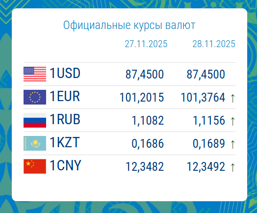 27.11.2025, 16:38Национальный банк обновил официальный курс иностранной валюты с кому на 28 ноября. Информация об этом размещена на сайте регулятора.