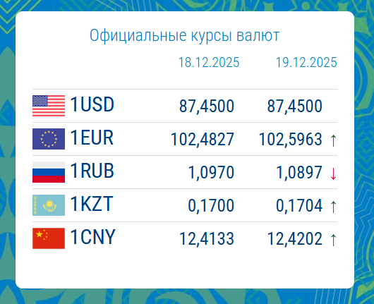 18.12.2025, 16:28На 19 декабря 2025 года официальный курс доллара США составил 87.4500 сома, не изменившись по сравнению с предыдущим днем.