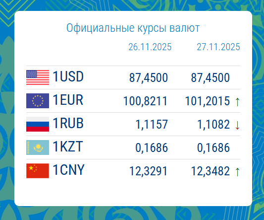 26.11.2025, 16:29На 27 ноября 2025 года официальный курс доллара США остался без изменений и составил 87.4500 сома.