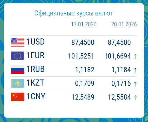 19.01.2026, 16:15На 20 января 2026 года официальный курс доллара США остался на уровне 87.4500 сома, без изменений по сравнению с 17 января.
