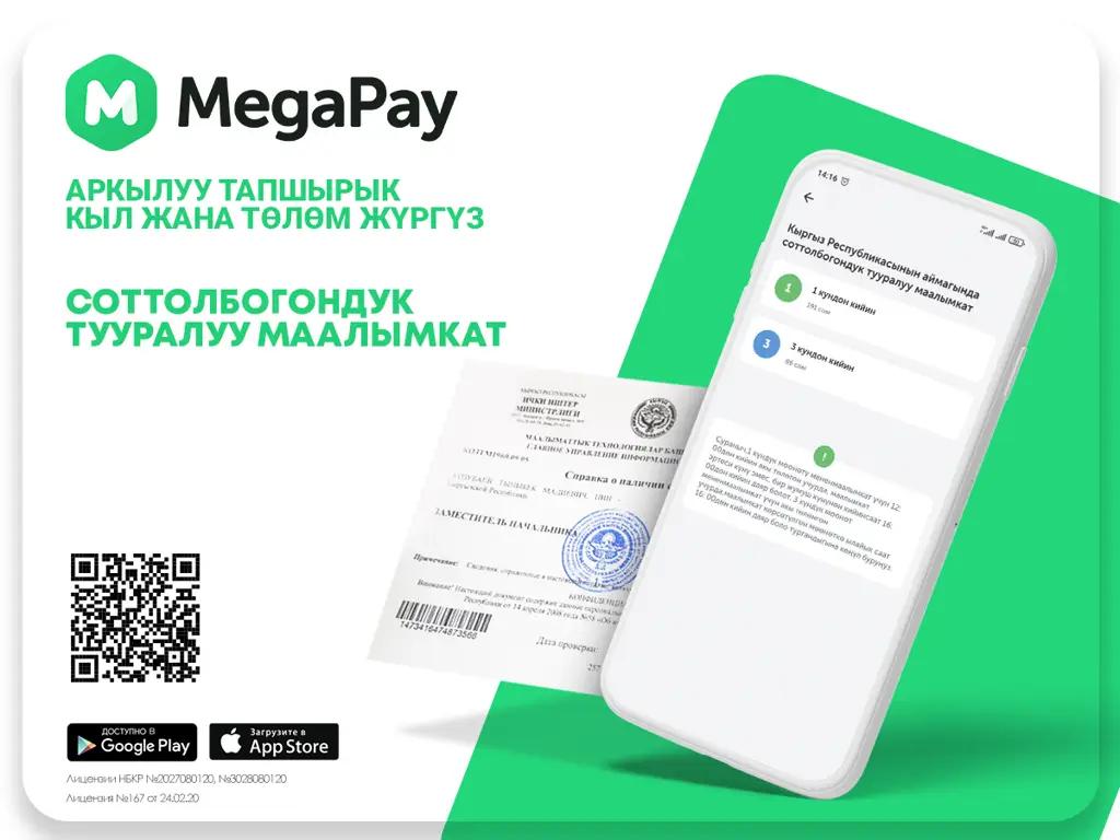 27.07.2021, 06:50MegaCom компаниясы абоненттерге ыңгайлуу болушу үчүн жаңы санарип кызматтарды киргизүүнү улантат. Эми MegaPay мобилдик тиркемеси аркылуу Кыргыз Республикасынын аймагында жарактуу болгон соттолбогондугу тууралуу маалымкатты тапшырык кылып жана ал үчүн акы төлөсө болот.