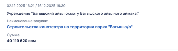 Кинотеатр планируют построить на территории парка Багыш в селе Октябрьское. Рассчитываемая сумма закупки составляет 40 млн 119 тысяч 620 сомов, а работы должны быть завершены до 1 марта 2026 года.