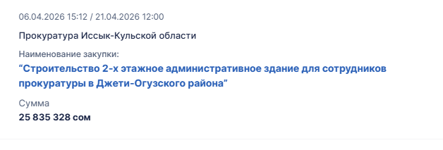 Прокуратура Иссык-Кульской области объявила тендер на строительство административного здания для сотрудников в селе Кызыл-Суу. Планируемая сумма закупки составляет 25 млн 835 тысяч 328 сомов. После заключения договора объект должны построить в течение 90 дней.